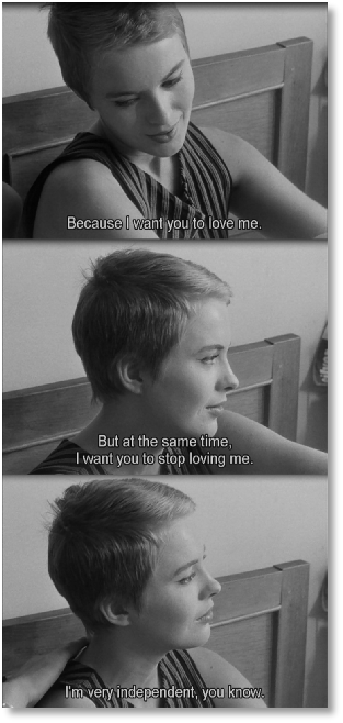 And there are the popular songs, the cultural references, the brand names. This is Godard at his most referential, risking obsolescence by making his films for and about the "Pepsi Generation," yet his generation is just as obsessed as Generation X with love, movies, and product.